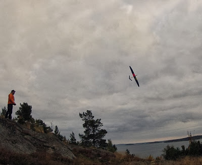 Jag hade bestämt mig för mer experiment med GoPro:n och planen var att försöka få lite olika vinklar så det blev lite omväxling, så jag riggade upp den med en passande sten som bas och kastade ut Weaseln först för lite lajande runt på låg höjd. Fortsatte med Minipipen och fick äntligen till en riktigt fin svepfartsesh med den, det har varit en lite råddig intrimning av den men det är en annan historia, nu flög den äntligen utmärkt.